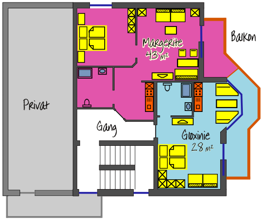 Die Ferienwohnung „Gloxinie“ ist mit einem Wohn-Schlafraum ausgestattet, und verfügt über ein Doppelbett und eine Schlafcouch. Im Appartement „Margerite“ befindet sich zusätzlich ein separates Schlafzimmer und ein Wohnzimmer, das eine weitere Schlafmöglichkeit bereithält.